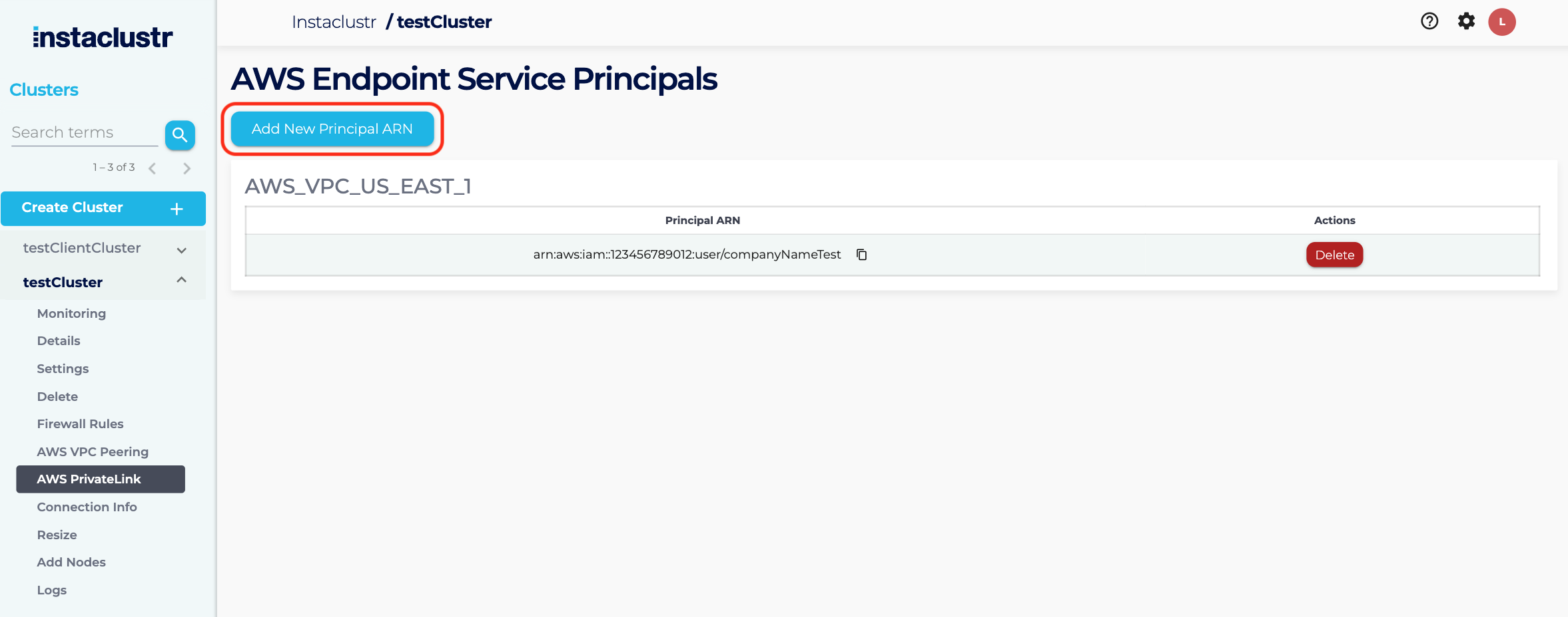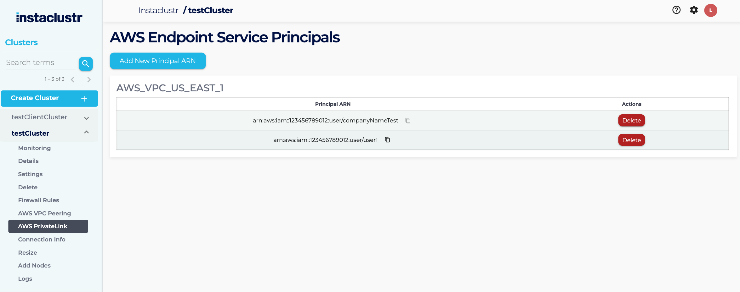 This article describes how to manage AWS Endpoint Service Principals for PrivateLink clusters using the Instaclustr Console. ARN stands for Amazon Resource Name and uniquely identifies AWS resources. You can read more about ARNs here. AWS principals, such as AWS accounts, IAM users, and IAM roles can be used to allow a connection from your endpoint to a PrivateLink cluster’s endpoint service privately. You can read more about PrivateLink and our support for it here. Our interface for the AWS Endpoint Service Principals provides the following functions:
