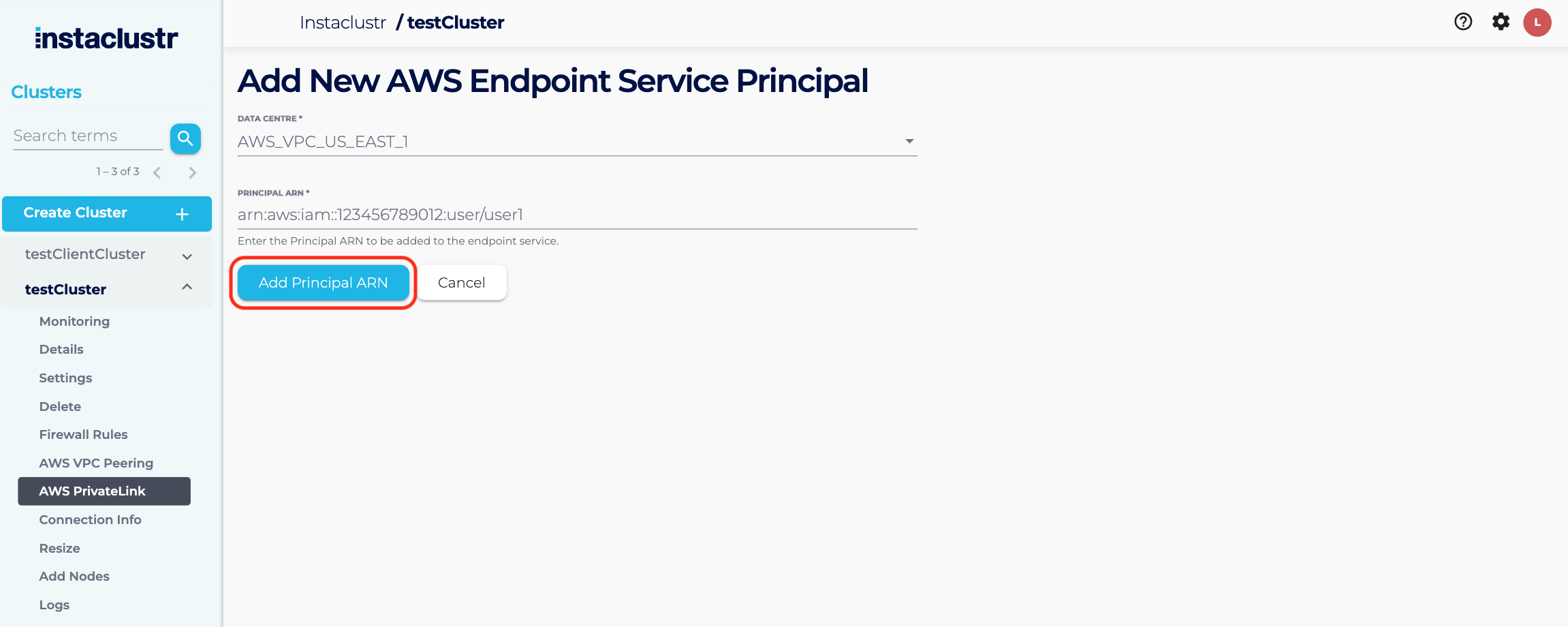 - Fill in the required information on the Add New AWS Endpoint Service Principal and click the Add Principal ARN button.