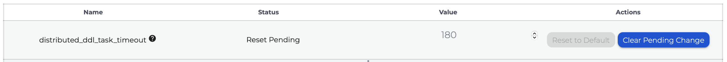 - Applying the changes updates the ClickHouse configuration to the cluster and can take up to a couple of minutes. During this time, you are unable to apply further pending changes to the cluster.