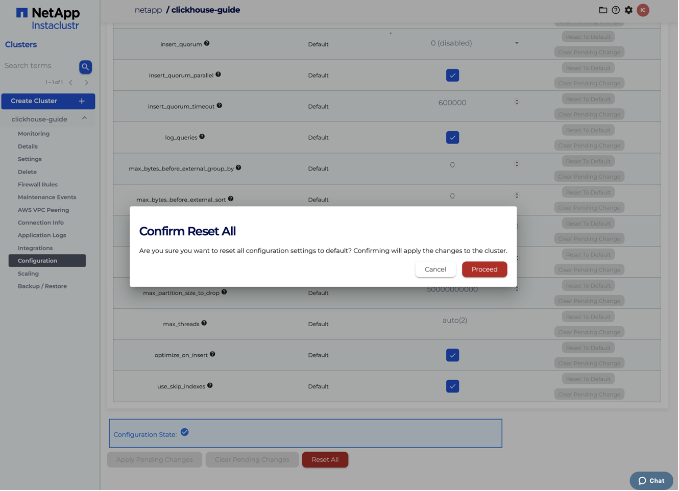 - The “Restore All” button will reset all parameters to the default value. This button requires confirmation via a pop up window and once “Proceed” is clicked the configuration will be loaded onto the cluster.