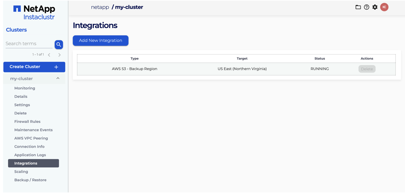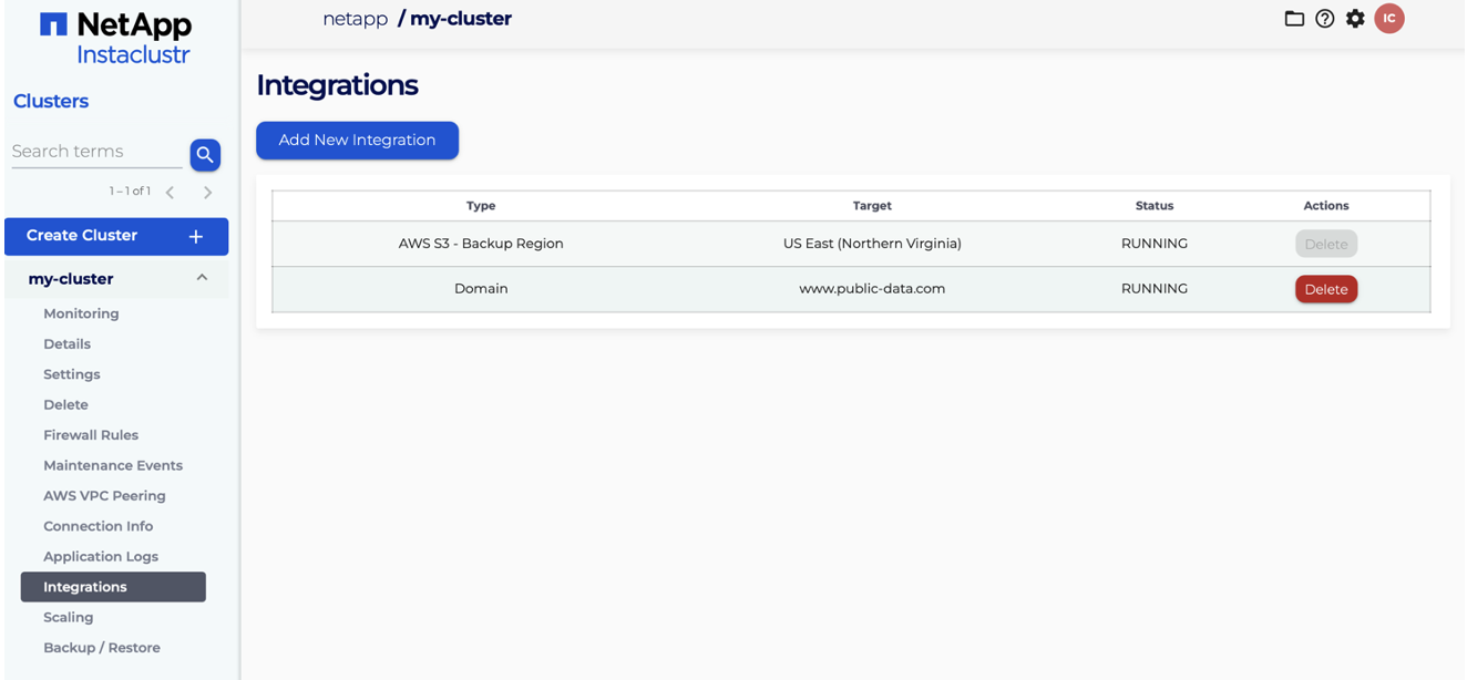- The Integrations table now shows the newly configured integration. An integration can be deleted by pressing the “Delete” button, disabling access to the region.