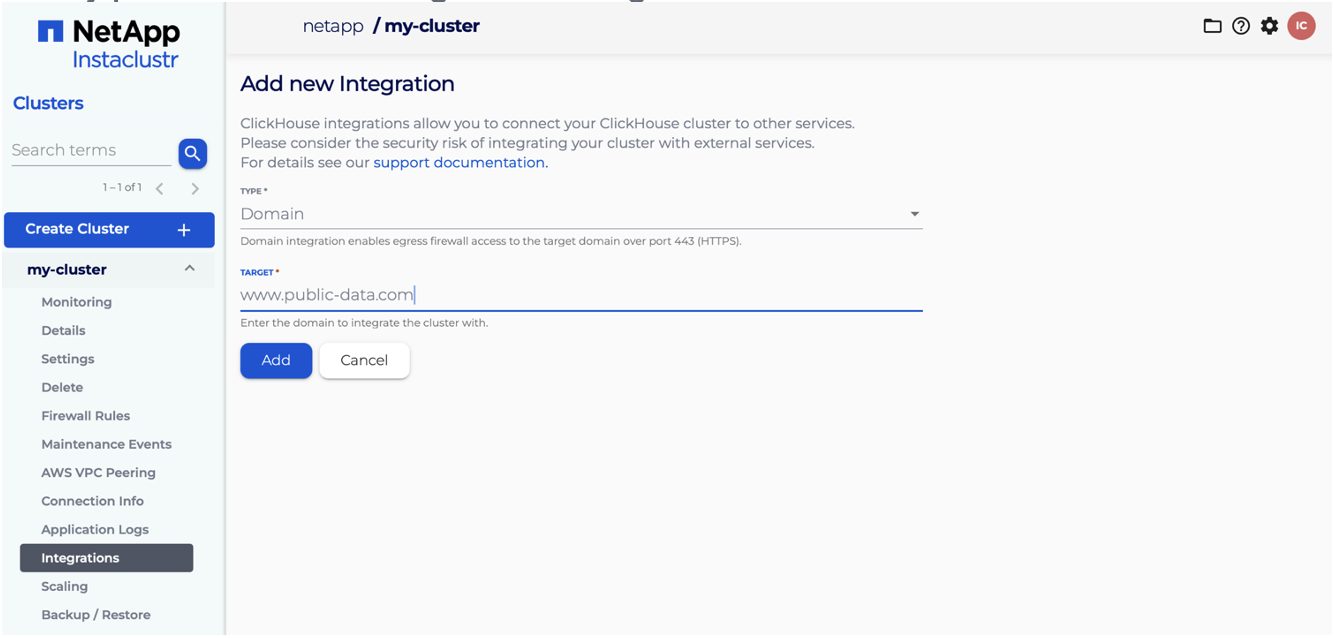 Clusters on the Netapp Instaclustr managed platform are secured through egress firewall rules to protect against data exfiltration. Integrating with Domains adds a whitelist rule to the firewall enabling access. Consider the security risk before enabling a Domain integration.