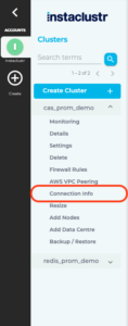 - Select which Cluster you wish to monitor from the left hand navigation, then select Connection Info. Note: if you wish to monitor all of this account’s clusters you can also follow this step.