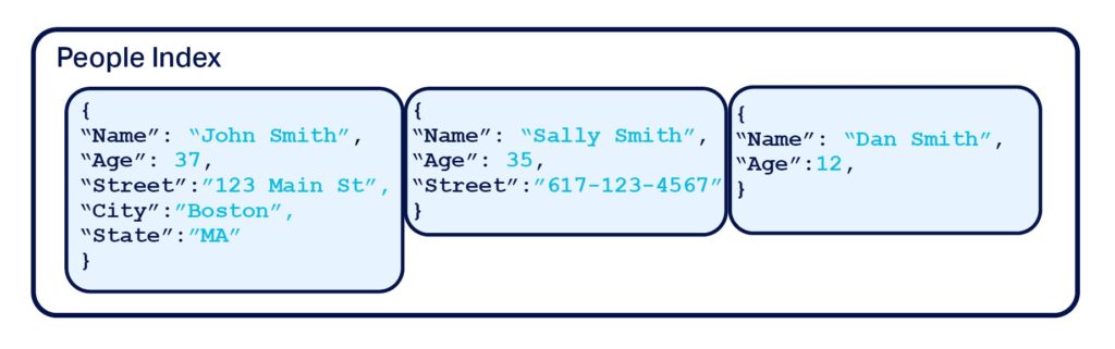 As an example, the following customer index has documents about a store’s customers. Though the documents will all have similar content, some fields may only appear only in certain documents.