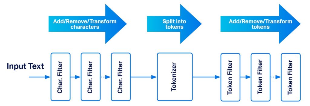 For instance, the standard analyzer breaks text into grammar-based tokens and the whitespace analyzer breaks text into terms based on whitespace. An analyzer is a combination of character filters, tokenizers, and token filters. Custom analyzers can be built using the appropriate set of filters and tokenizers.