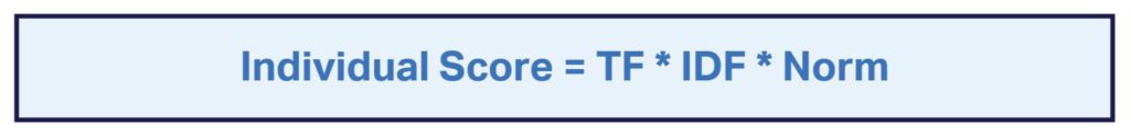 IDF: How frequently the term appears across all documents in the index. If it appears more commonly, then the term is less relevant. Common words such as “the” could appear many times in an index and a match against them is less important.