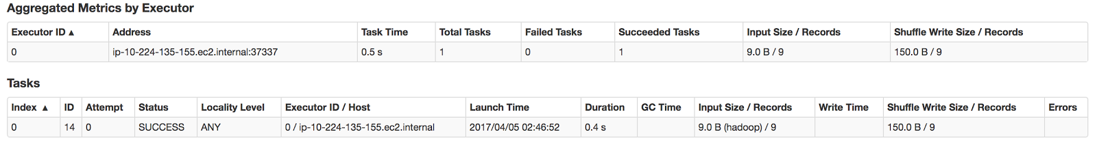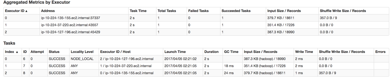 Amongst other things, the Tasks table is showing that all three of our executors processed the Stage pipeline and performed full Cassandra table scans (something that should generally be avoided), with only one of them (ip-10-224-135-155.ec2.internal) actually ending up with any data.