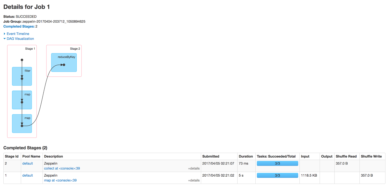 From here, we can see that the Job took over 5 seconds to complete and the bulk of that time was spent in Stage 1, gathering and filtering 1,118.5 KB of data (the DAG visualization also shows a nice graphical summary of the RDD lineage).
