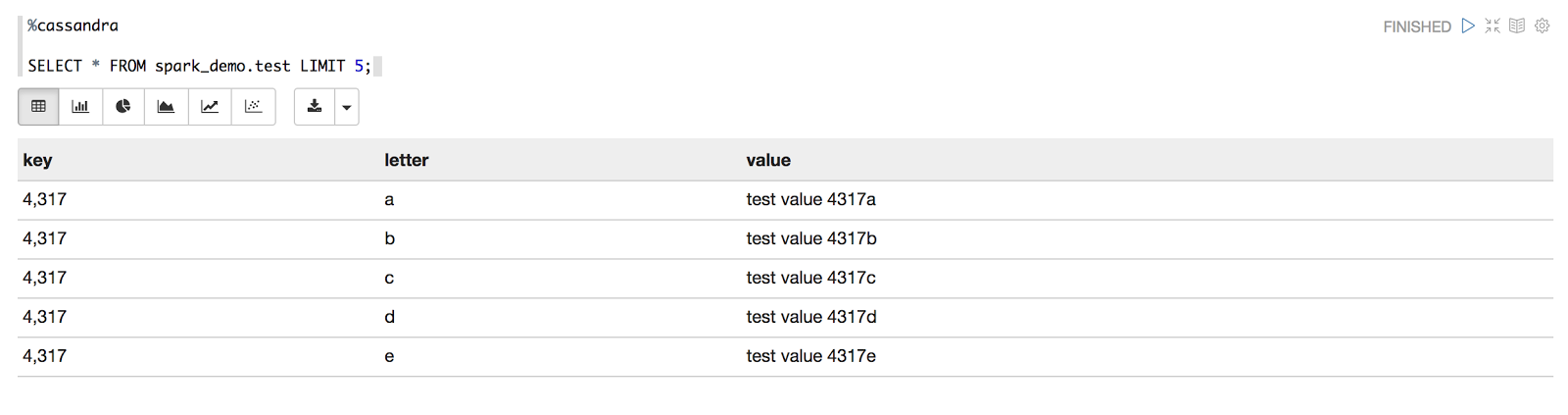 %cassandra // Step 1: Create table CREATE KEYSPACE IF NOT EXISTS spark_demo WITH REPLICATION = { 'class': 'NetworkTopologyStrategy', 'AWS_VPC_US_EAST_1': 1 }; CREATE TABLE IF NOT EXISTS spark_demo.test( key int, letter text, value text, PRIMARY KEY(key, letter) ); INSERT INTO spark_demo.test (key, letter, value) VALUES (1, 'a', 'test 1'); SELECT * FROM spark_demo.test; |