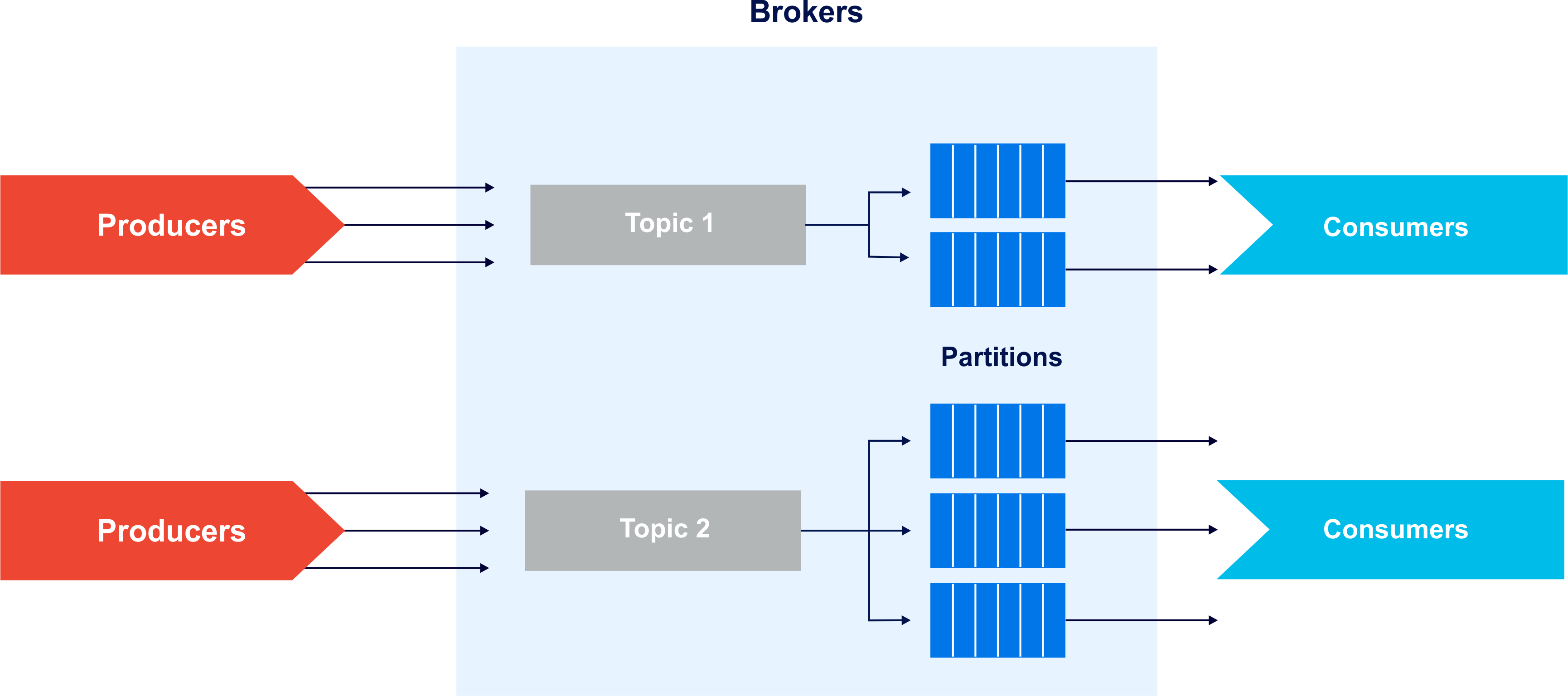 - Kafka Brokers: Brokers are the Kafka instances where data published by the producer is made available to consumers by subscription. Kafka ensures fault tolerance by replicating data across multiple broker instances. Kafka brokers contain topic log partitions, where data is stored and distributed: