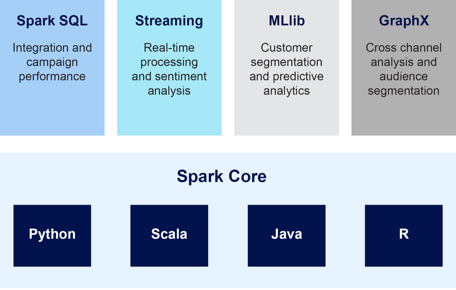 An example of Apache Spark’s architecture designed to measure the effectiveness of a new car ad campaign. The combination of Spark components is used to measure the campaign’s reach and performance (Spark SQL), monitor sentiment in real-time across social media and news sites (Streaming), forecast future sales based on buyer segment (MLib), and visualize target audiences across channels (GraphX). (Source: Instaclustr)
