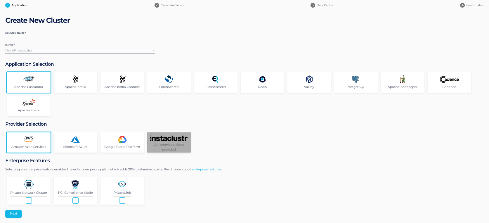 - Under the Application section, enter an appropriate name for your cluster, select Valkey as the base application, and choose your desired infrastructure provider. You will be able to customise specific configurations matching your performance and pricing requirements in the following sections of the wizard. You also have the option to select an SLA Tier and add any additional enterprise features to your cluster. Read more about our supported SLA Tiers and Enterprise Features to decide what is most appropriate for your use case.