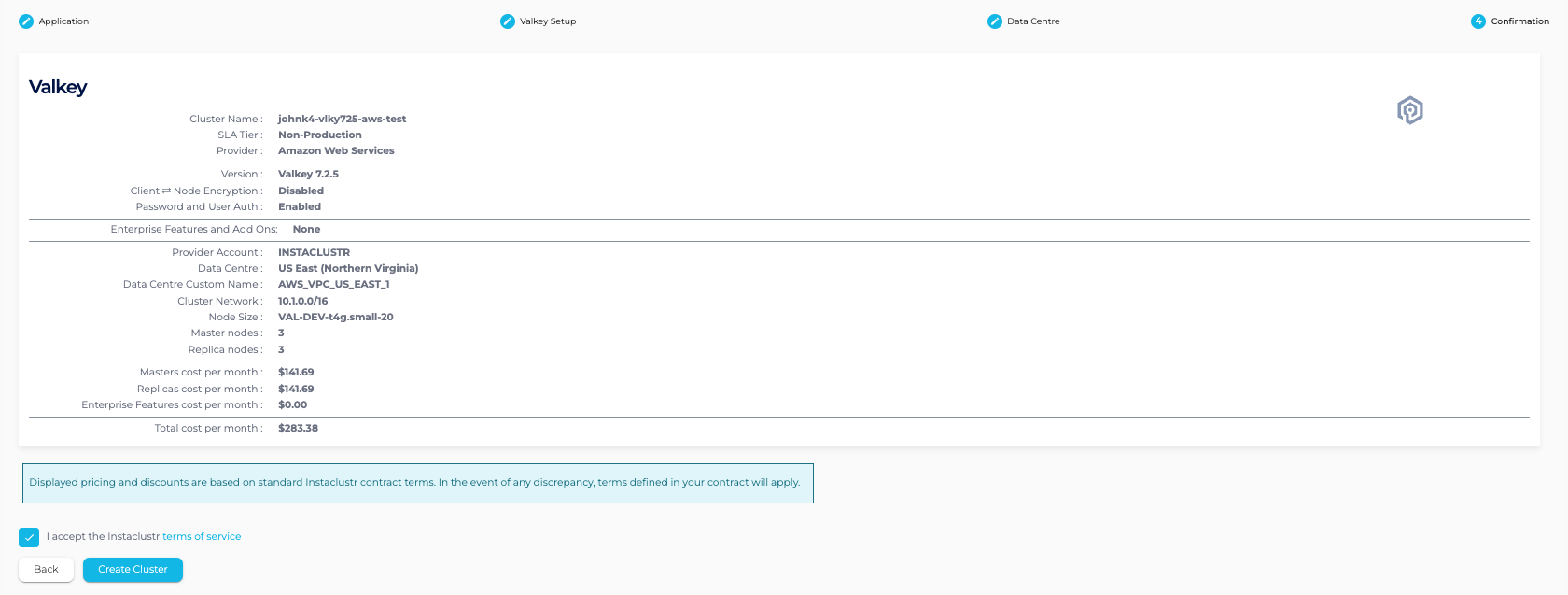 - The Confirmation section displays a brief summary of your cluster configurations and pricing details. Click the Terms and Conditions link to open the Instaclustr Terms and Conditions. After going through the document, select the checkbox to accept the Terms and Conditions. Once you are happy with the cluster configuration and have accepted the terms and conditions, click the Create Cluster button to start provisioning the cluster.
