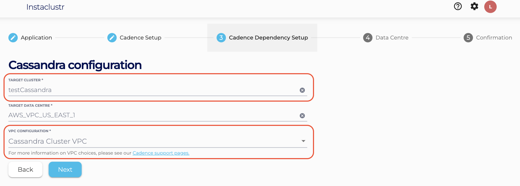 In addition to selecting which Cassandra cluster to link to, we can select how they are linked and communicate over the network, i.e. the Cadence VPC configuration. Configuring the Cadence VPC gives a detailed explanation about the different approaches to configuring the Cadence VPC. - Under the Data Centre section,