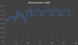 Here’s the result of a run on 1 week of the new data using the incremental algorithm. The best accuracy is 0.72. The x-axis is just the loop number (multiply by 100 to find out how much data has been processed so far).
