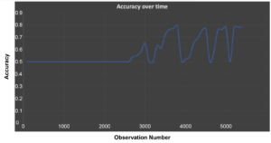 The above code worked ok, but I could think of several refinements to make it more useful before running the experiments. For example, given that I was using all the data for training, I was worried about overfitting, and also how to evaluate the model. The solution I came up with was to use 80% of each batch for training, and 20% for evaluation. But I also decided to keep up to the most recent 1000 observations for evaluation. I also wanted to keep track of the evaluation accuracy over time, so I kept the result in a list. Here’s close to the final code with these and a few more metrics added to it: