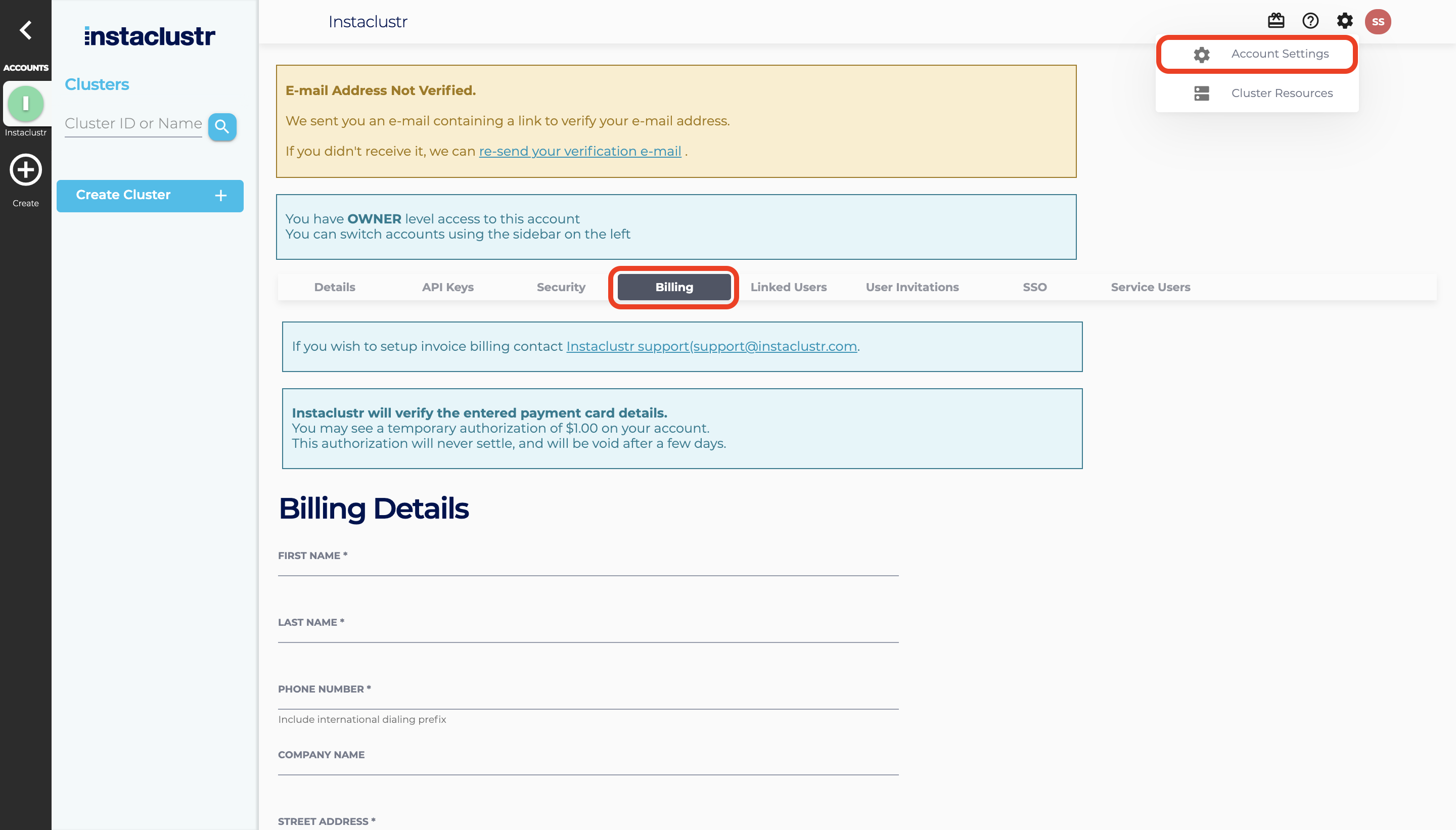 - Note that the 30 day free trial allows for one small cluster running at a time. To create additional clusters you will need to submit your billing information. To enter billing information, click on Account Settings and then navigate to the Billing tab.