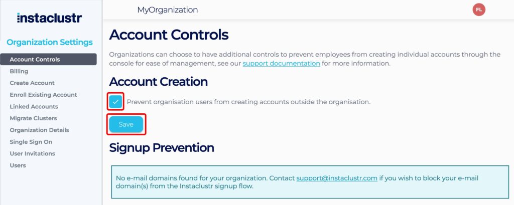 Organizations can choose to have additional controls to prevent employees from creating individual accounts through the console for ease of management. These additional controls are provided through the option to block non-Organization Owners from creating new Instaclustr Accounts, and the ability to block e-mail domains owned by the Organization on the user signup flow.