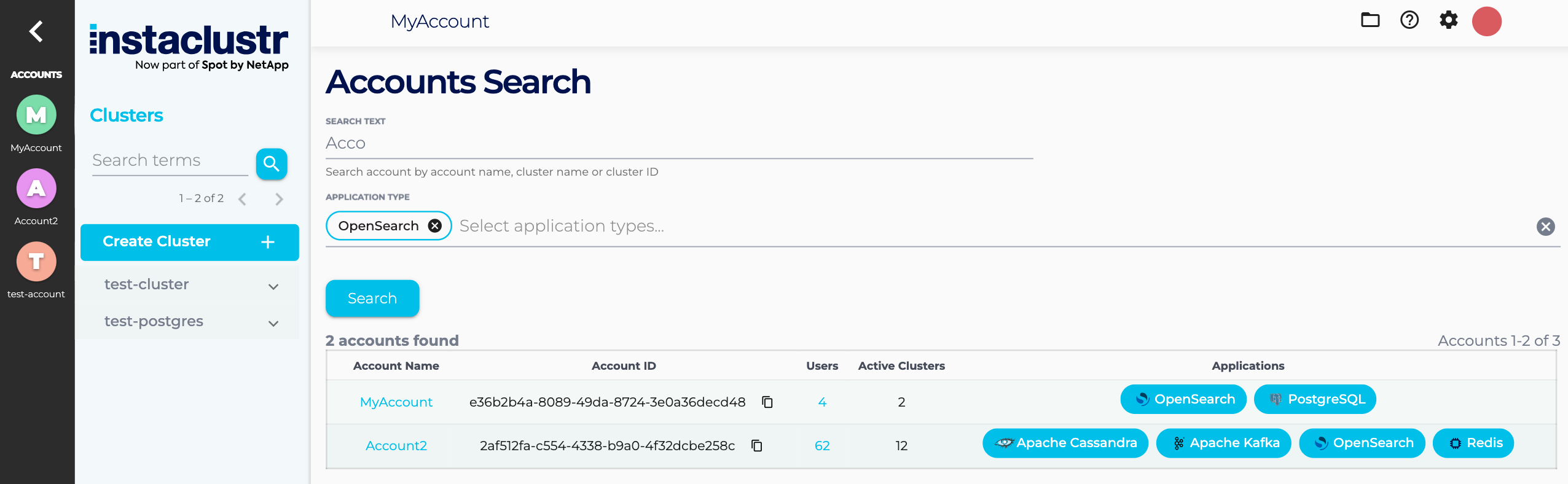 - Search results will display all the accounts matching the criteria along with details of each account such as account ID, number of active clusters in it, and type of applications within that account.