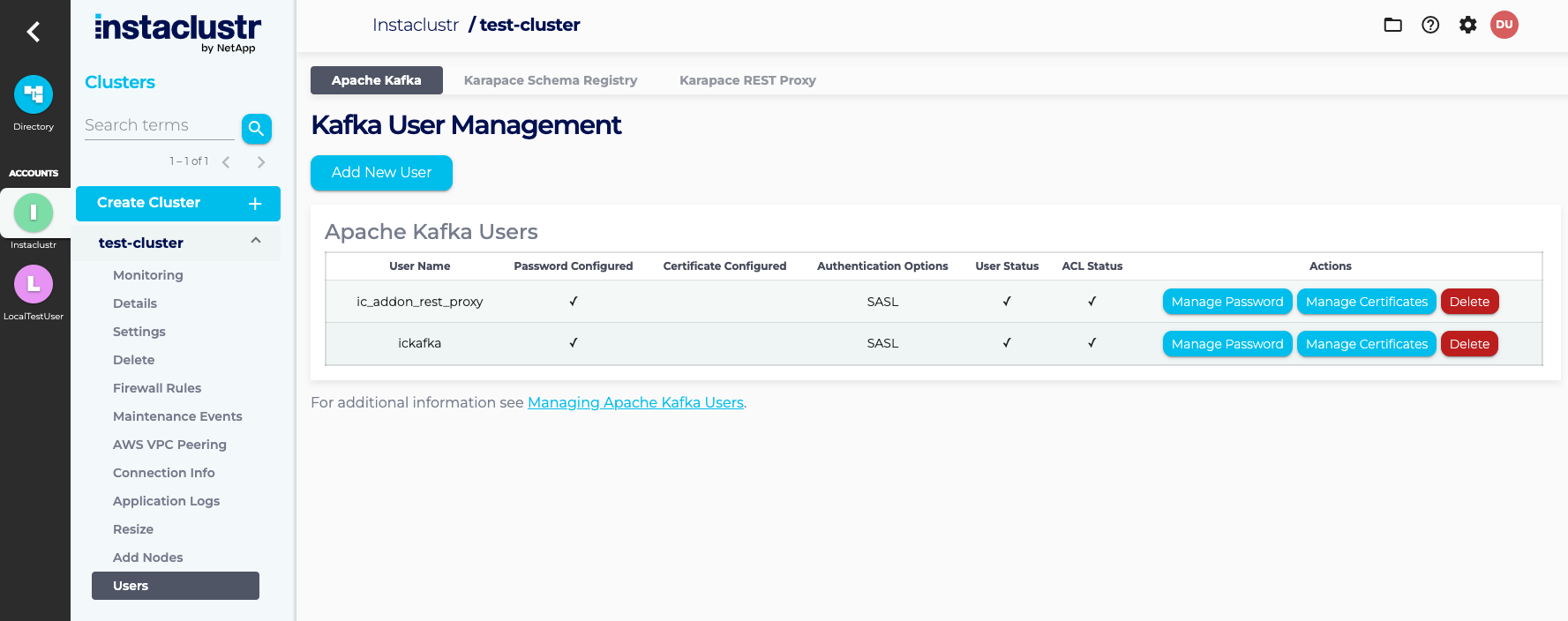 Instaclustr provides both a User Management UI and User Management API for Kafka clusters to help you with managing users. The User Management UI and API provide four functions:- List Users