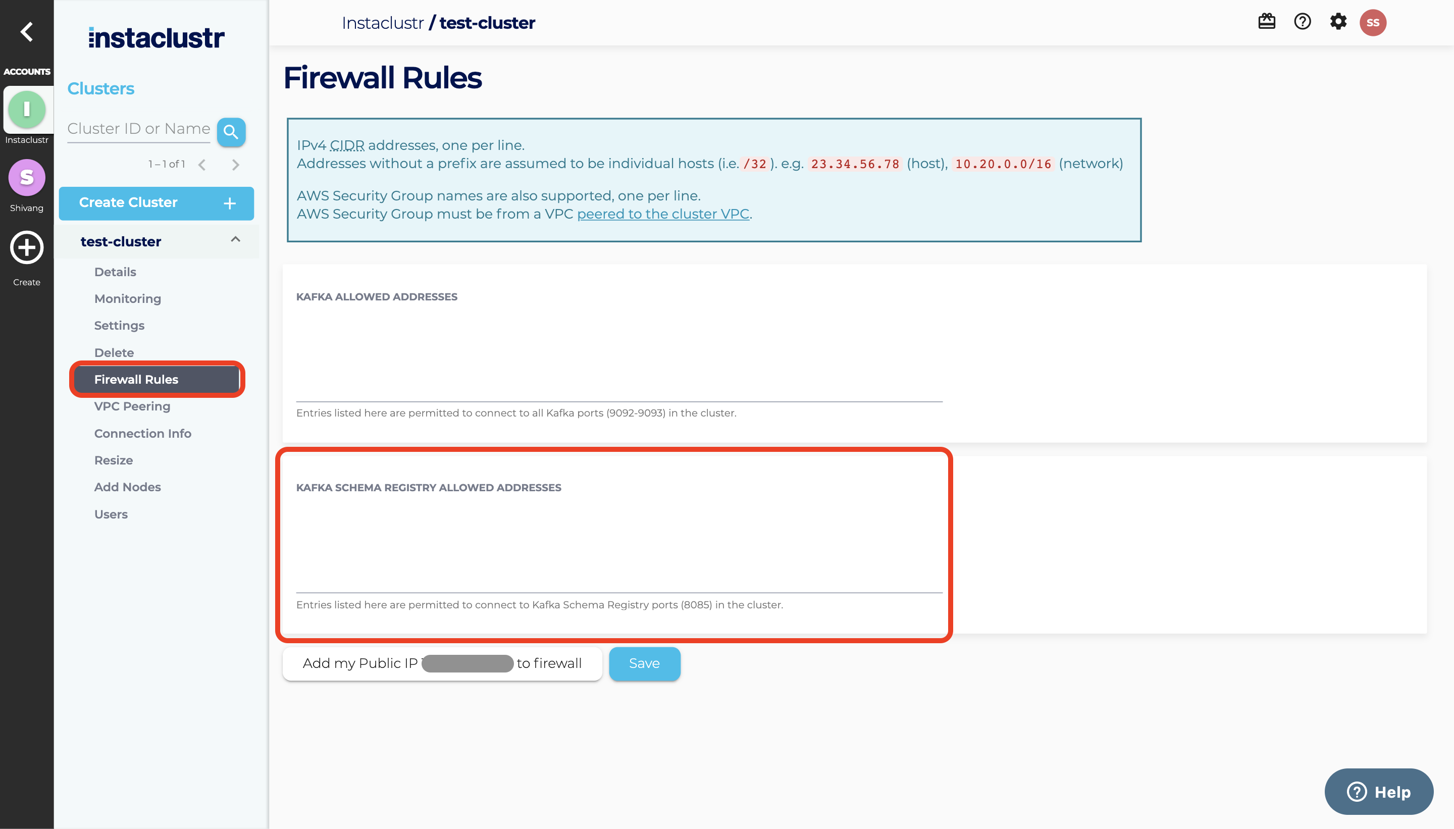 Before we can access our schema registry application, we need to open the firewall to our client application IP address. Once your cluster is up and running, go to Firewall Rules and add your IP address to the Kafka Schema Registry Allowed Addresses.