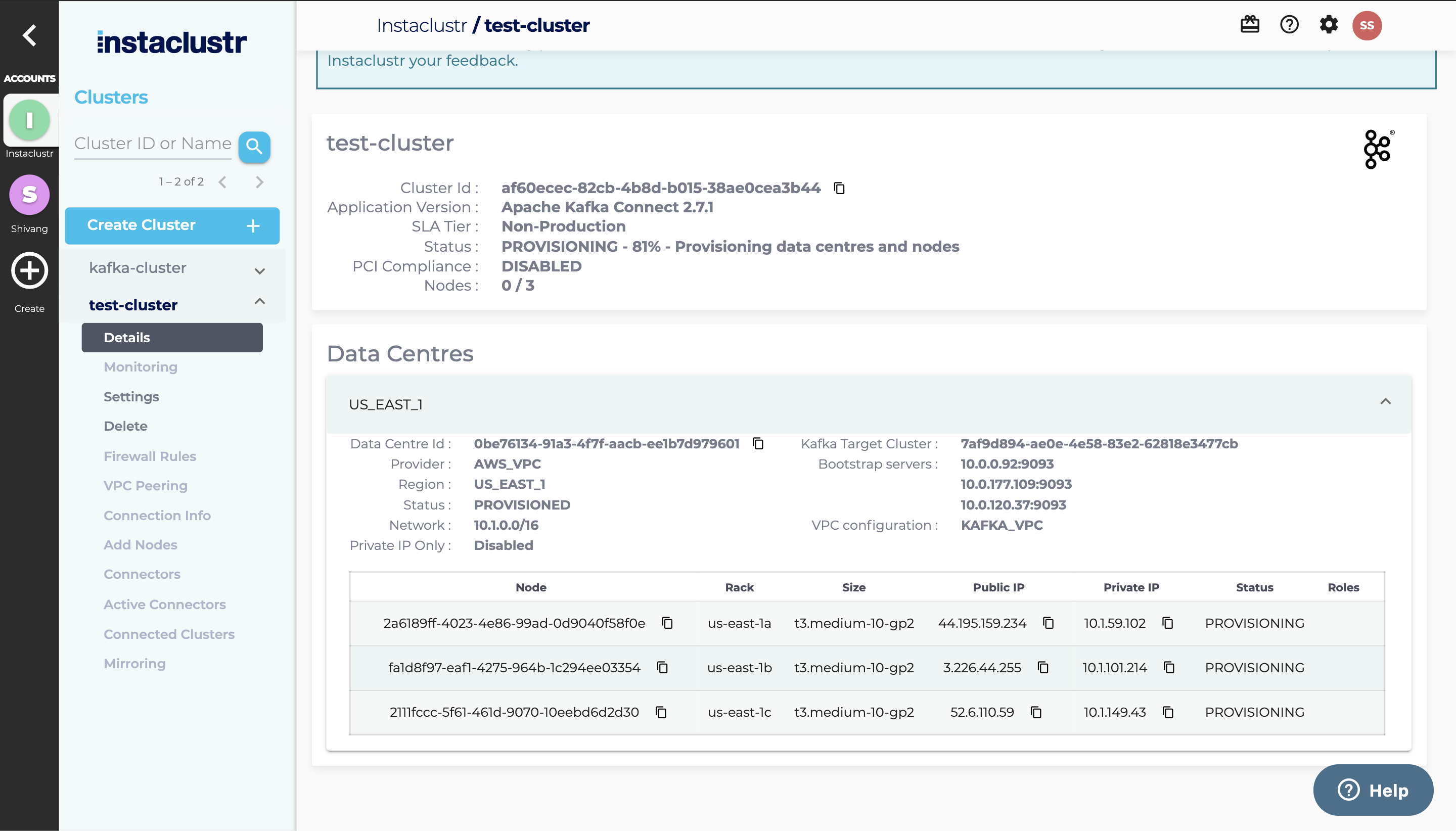 - A Kafka Connect cluster needs a Kafka cluster to connect to. You can either connect to an Instaclustr managed Kafka cluster or a non-Instaclustr Kafka cluster. To create a new Kafka cluster with Instaclustr, you can follow the instructions provided by our support team. If you already have an external Kafka cluster, read this article on using non-instaclustr Kafka clusters for more information.