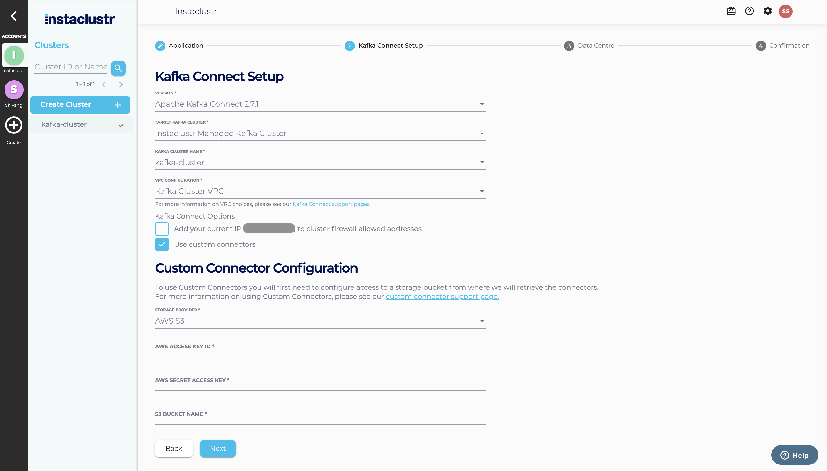 The third option is to provision the Kafka Connect cluster in a new VPC without setting up peering. This will cause the Kafka Connect and Kafka clusters to connect over public IPs. - If you plan on using your own custom connectors (bring your own code) on your Kafka Connect cluster, tick the Use Custom Connectors checkbox and fill out the name and access credentials of the cloud storage area where you will be placing your custom connectors. See our support page on how to set up a cloud bucket to store custom connectors for more information.