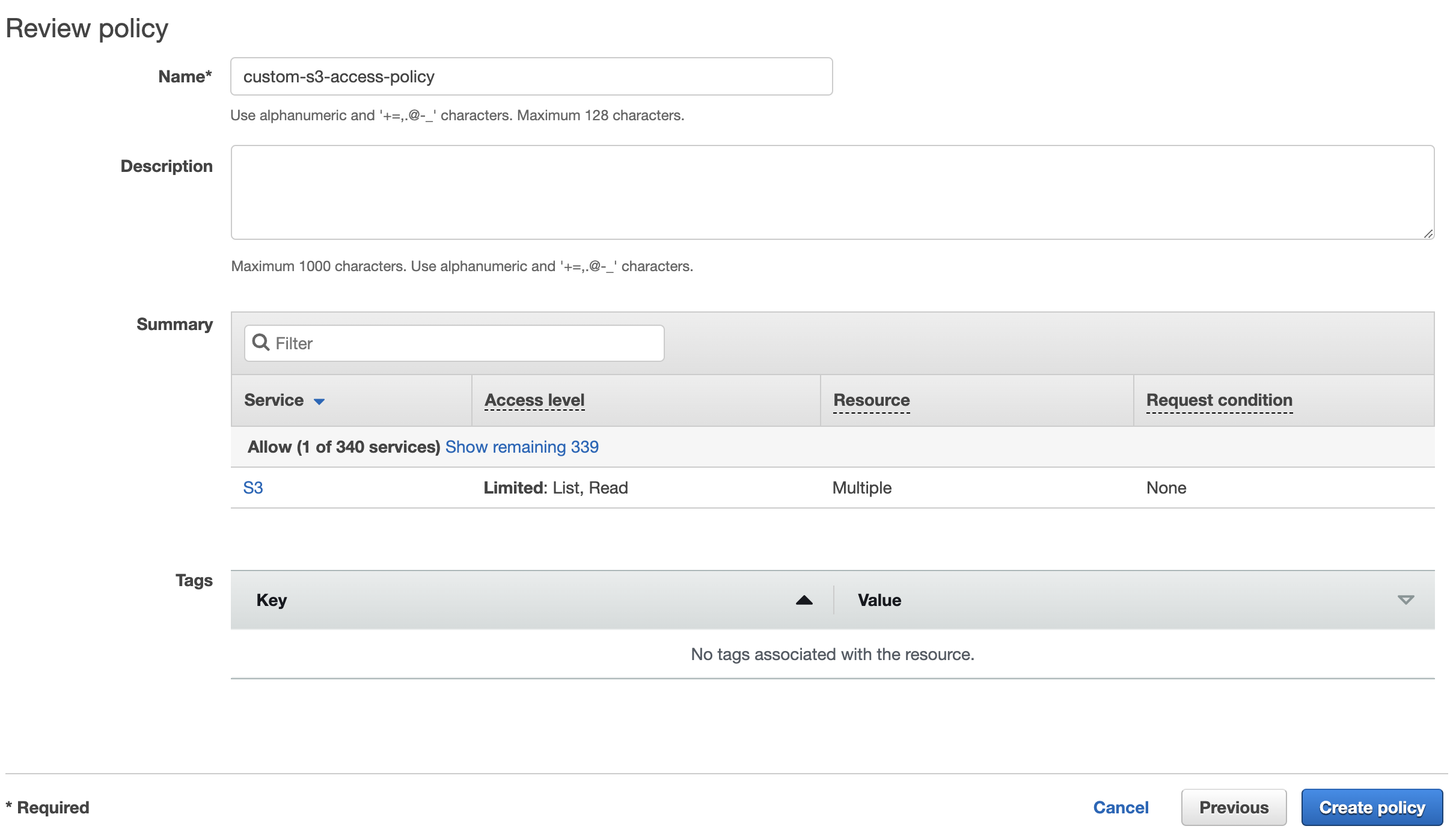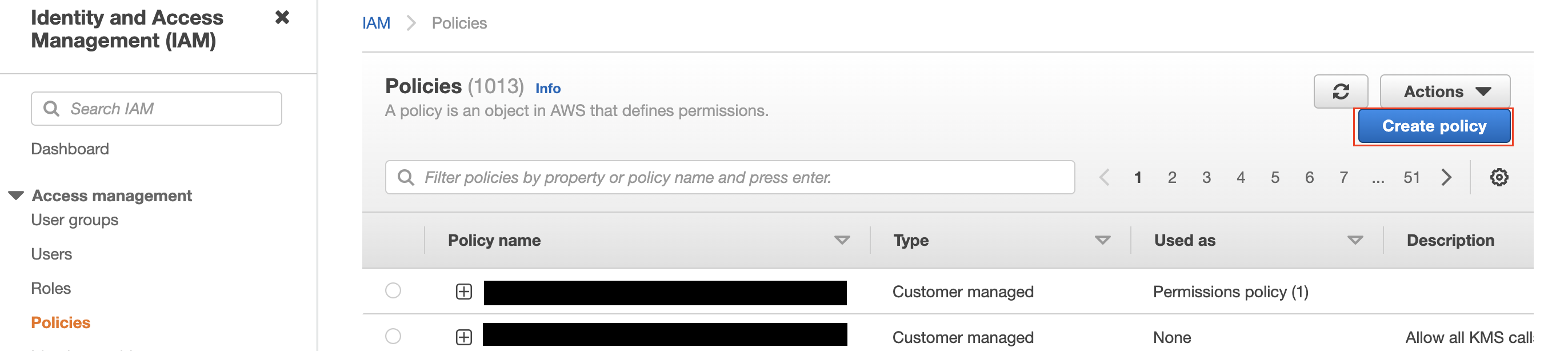 1234567891011121314151617{"Version": "2012-10-17","Statement": [{"Sid": "1","Effect": "Allow","Action": ["s3:ListBucket","s3:GetBucketLocation"],"Resource": "arn:aws:s3:::<S3 bucket name>"},{"Sid": "2","Effect": "Allow","Action": "s3:GetObject","Resource": "arn:aws:s3:::<S3 bucket name>/*"}]} - Create the policy: