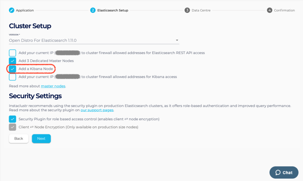 What are the benefits of Kibana? Adding Kibana to your Open Distro For Elasticsearch cluster provides powerful analytics and visualization capabilities in real time. Kibana provides a powerful interface to Elasticsearch enabling you to explore your data with aggregations, filters, graphs and create dashboards. In addition Kibana provides an interface to manage role based security for your cluster. In order to create an Open Distro for Elasticsearch Cluster with Kibana, simply enable the Add a Kibana Node checkbox during the Elasticsearch Setup step of creating a new cluster. Note that there is an option to add a firewall rule for your computer to connect to the Kibana web interface.