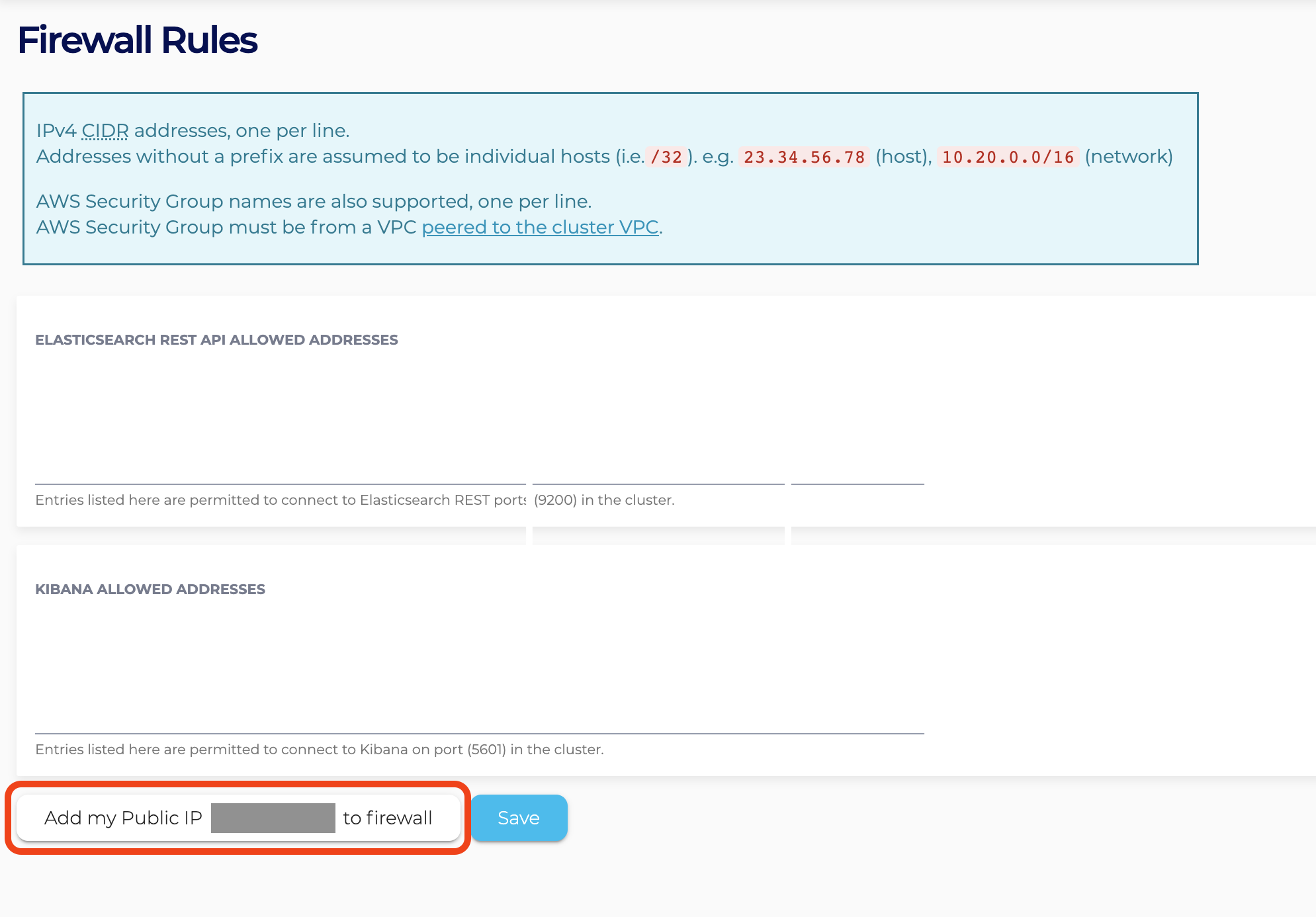 - Under the Firewall Rules section, enter any additional IP addresses you wish to trust to the Elasticsearch Allowed Addresses list. If your cluster is running on AWS and clients are connecting using VPC peering, then you may also add one or more AWS security groups to the list. Click the Save Cluster Settings button when you are finished. Click Add my Public IP to firewall to add your public IP address to the cluster firewall and then Save to save your changes.