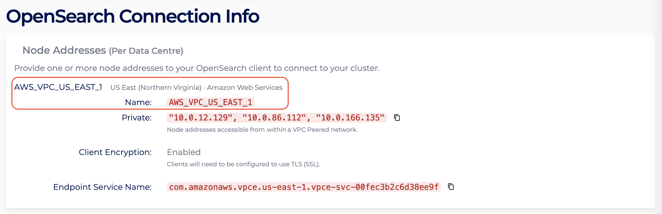 - In the Connection Info page, identify the region of the created OpenSearch PrivateLink cluster. For instance, the page shows the region is US_EAST_1, hence access to the AWS VPC Endpoint console in the US_EAST_1 region: https://us-east-1.console.aws.amazon.com/vpc/home?region=us-east-1#Endpoints: