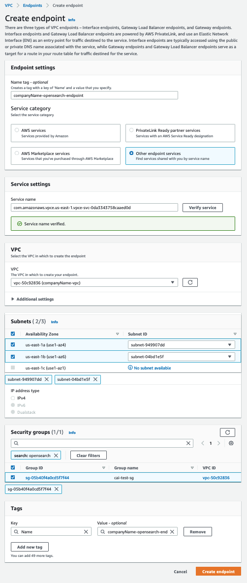 - Select the security group that you created earlier. You will get the following configurations. Once done, click Create endpoint.