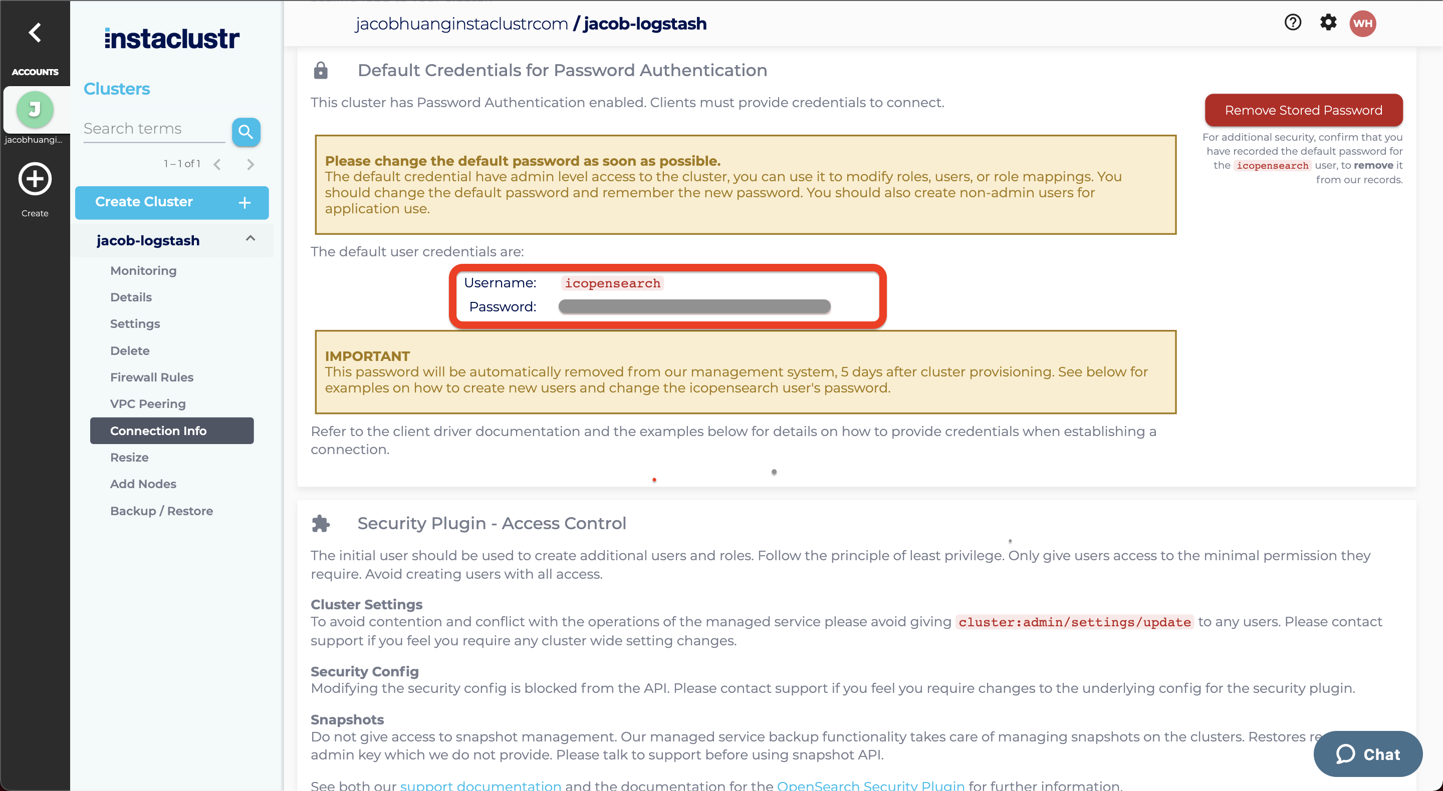 You must create an account for Logstash to use for connections to the cluster. To create the account, first, get your connection credentials. Under the “Connection Info” section of the console you will be met with the default credentials for your cluster. These credentials will be required to add a Logstash user account to the security plugin.