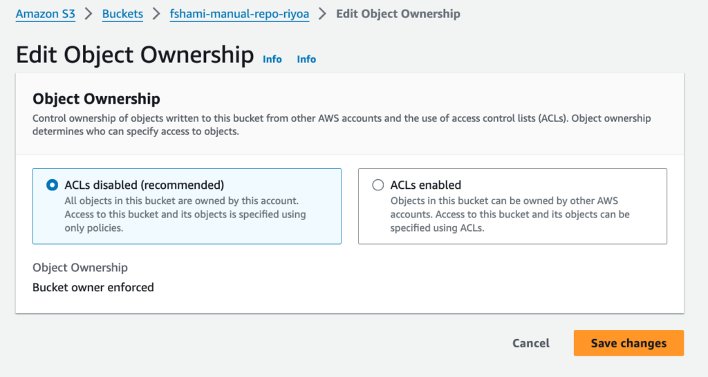 - Once the bucket’s policy changes are saved. Navigate to Edit “Object Ownership”, select “ACLs enabled”, keep the “Bucket owner preferred” setting and click Save Changes.