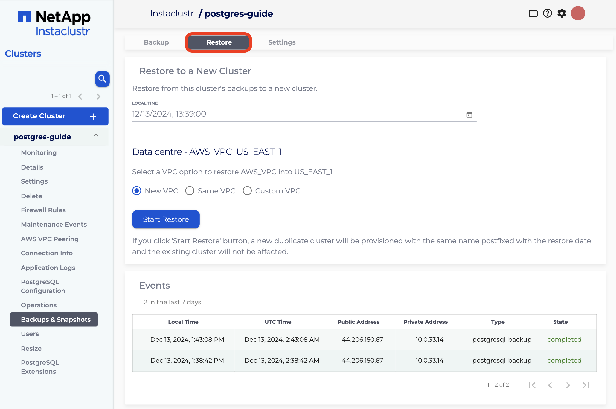 - New VPC: To restore a cluster into the New VPC.
