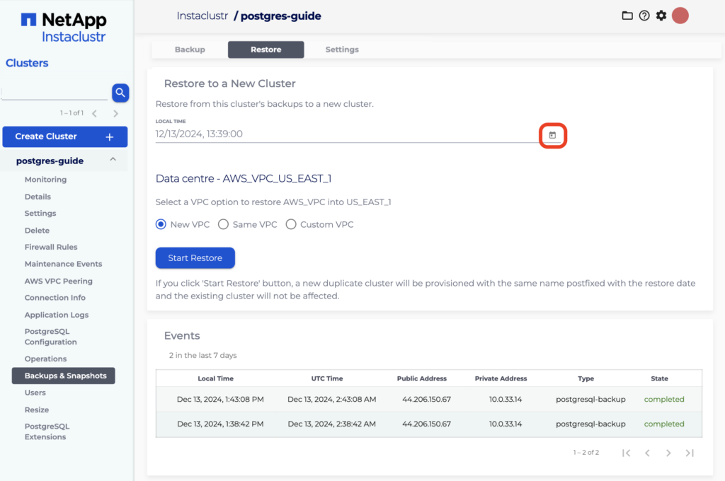 The restore page has a date and time selection field. The restore process will create a new cluster based on the most recent backup prior to the specified time. To specify the time, you need to click on the calendar icon next to the text field.