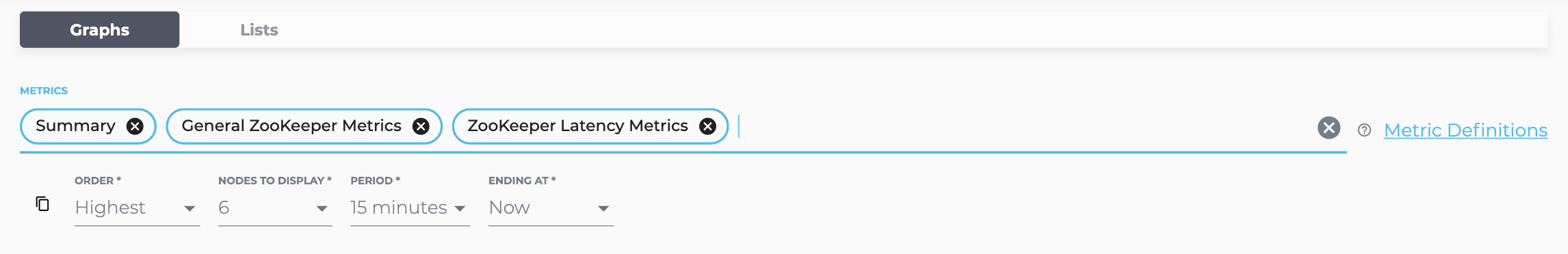 - Initially, the page will display only the Summary monitoring information: CPU Usage, Disk Usage, and Packets Sent and Received by ZooKeeper. However, you can access additional ZooKeeper specific metrics using the search bar at the top of the page. For example, you may add General ZooKeeper Metrics and ZooKeeper Latency Metrics to your monitoring page like so: