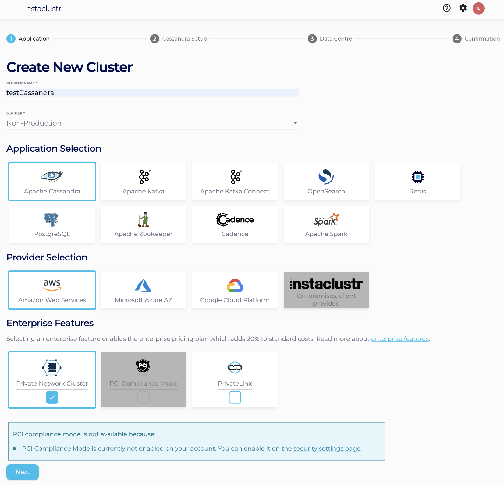 - Give your cluster a name, select Apache Cassandra as the application, select AWS as the provider, select Private Network Cluster, and click Next.