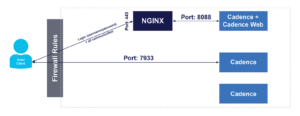 As seen from the diagram above, only ports 7933 and 443 are made public through the firewall for user-selected source IPs. According to the diagram, NGINX accepts user/client requests (i.e. all communications including username/password) on port 443 and forwards them to Cadence Web on port 8088. Under this architecture, when a user types <cadence_web_url> into the browser, he/she sees a username/password prompt like shown below.