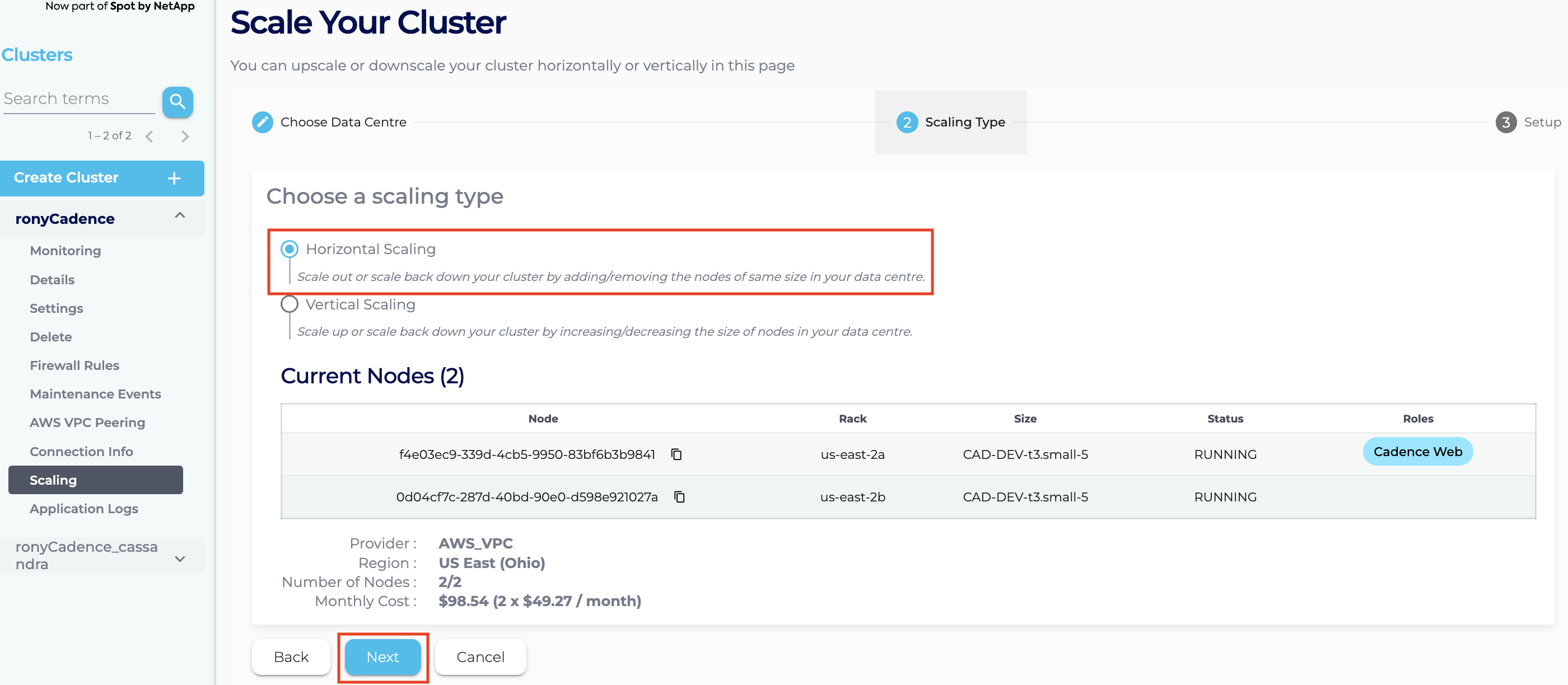 Horizontal Scaling can be used to increase (Upscale) or decrease (Downscale) the number of nodes in your cluster which in turn will increase or decrease the capacity of the cluster. To perform this scaling operation, navigate to the Scaling page for your Cadence cluster. The page will show you the current state of your cluster. Click Next.