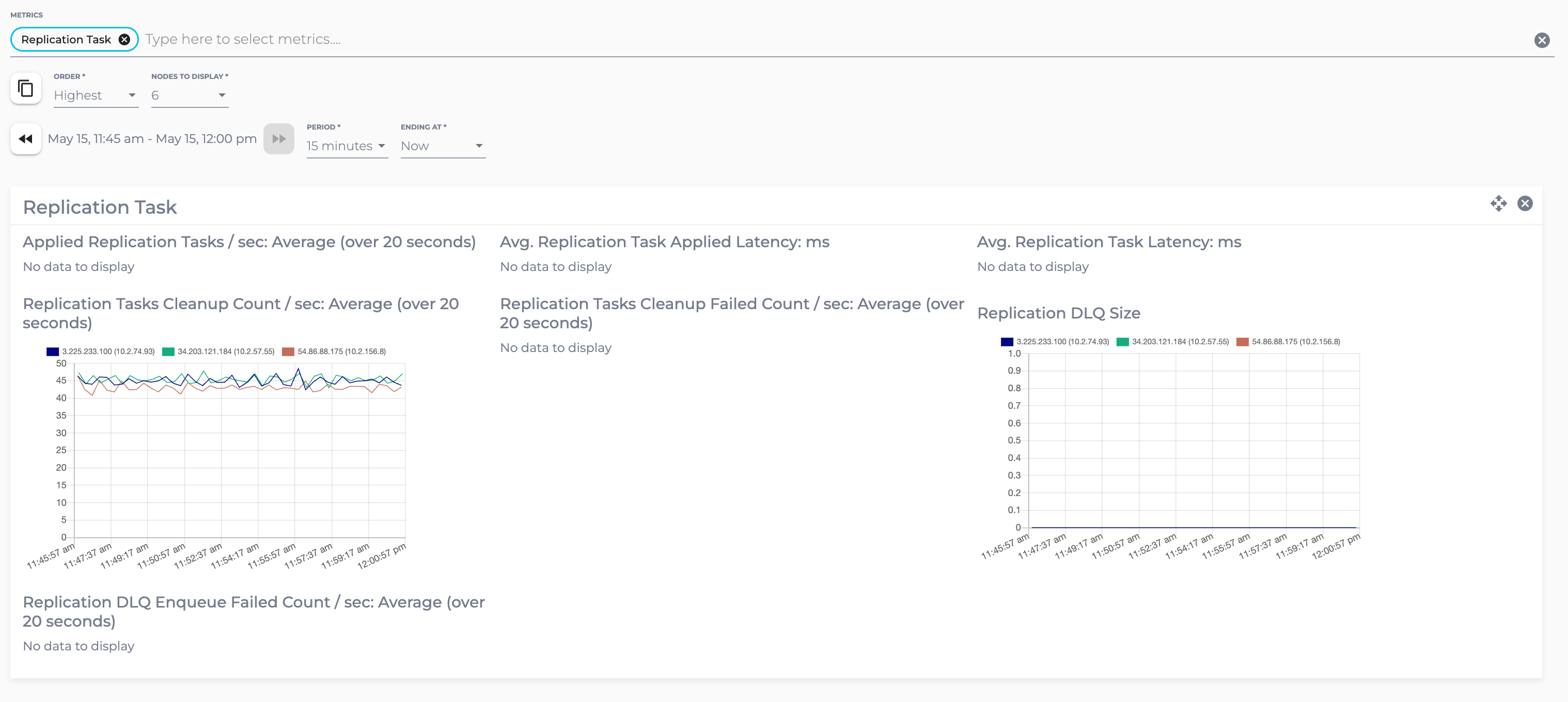 - Average Replication Task Latency: This is the average latency from replication tasks being created to them being applied, in milliseconds.