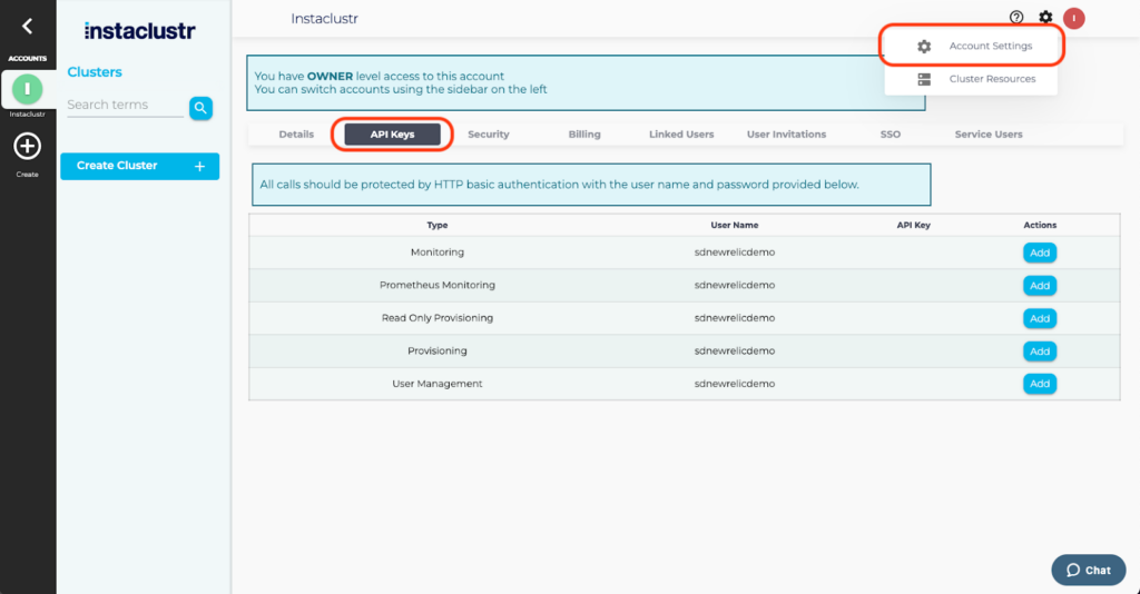 - On the Instaclustr Console, Go to Settings Cog > Account Settings > API Keys.