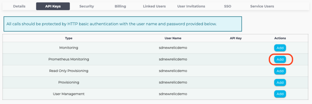 - Select Add to generate a Prometheus API key. Make sure to save the username and key in a safe place because for security reasons the key will not be accessible again.
